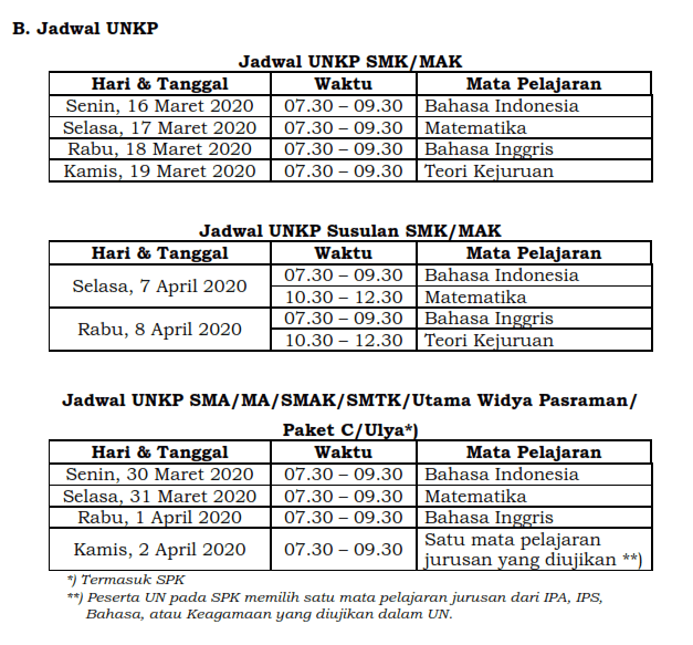 Ujian Nasional (UN) 2020 sudah semakin dekat. Bagi siswa yang akan mengikuti ujian ini, pastikan Anda sudah mempersiapkan diri dengan baik. Berikut jadwal pelaksanaan UN 2020: