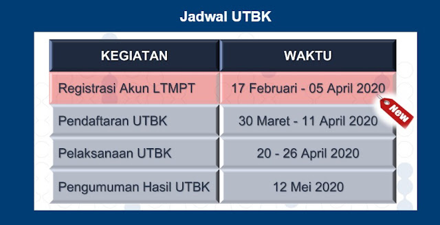 Jadwal Penting UTBK Masuk Perguruan Tinggi 2020Selain waktu pelaksanaan UTBK, terdapat juga jadwal penting UTBK yang harus diperhatikan oleh calon mahasiswa yang ingin masuk ke perguruan tinggi negeri. Berikut ini adalah jadwal penting UTBK masuk perguruan tinggi 2020.